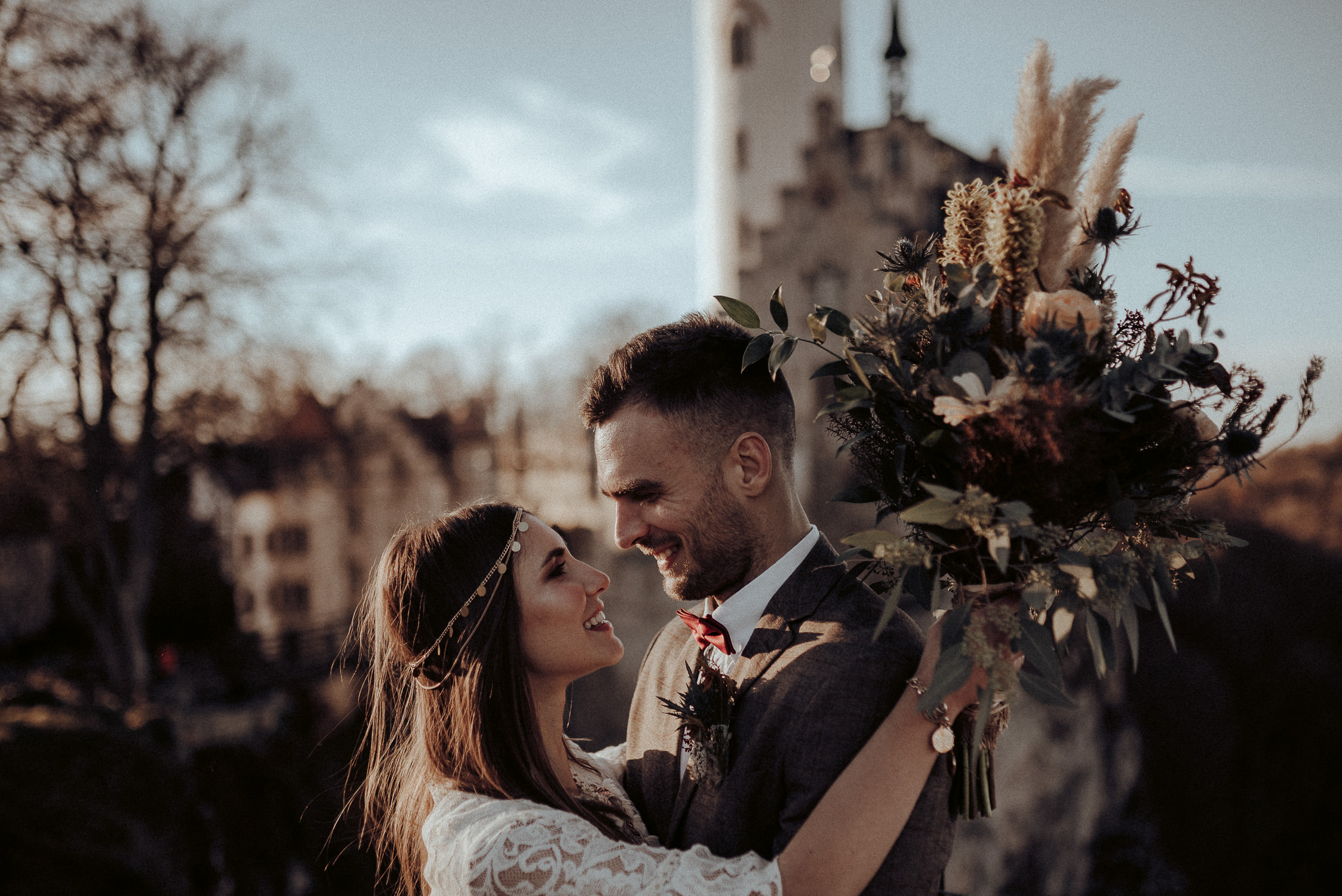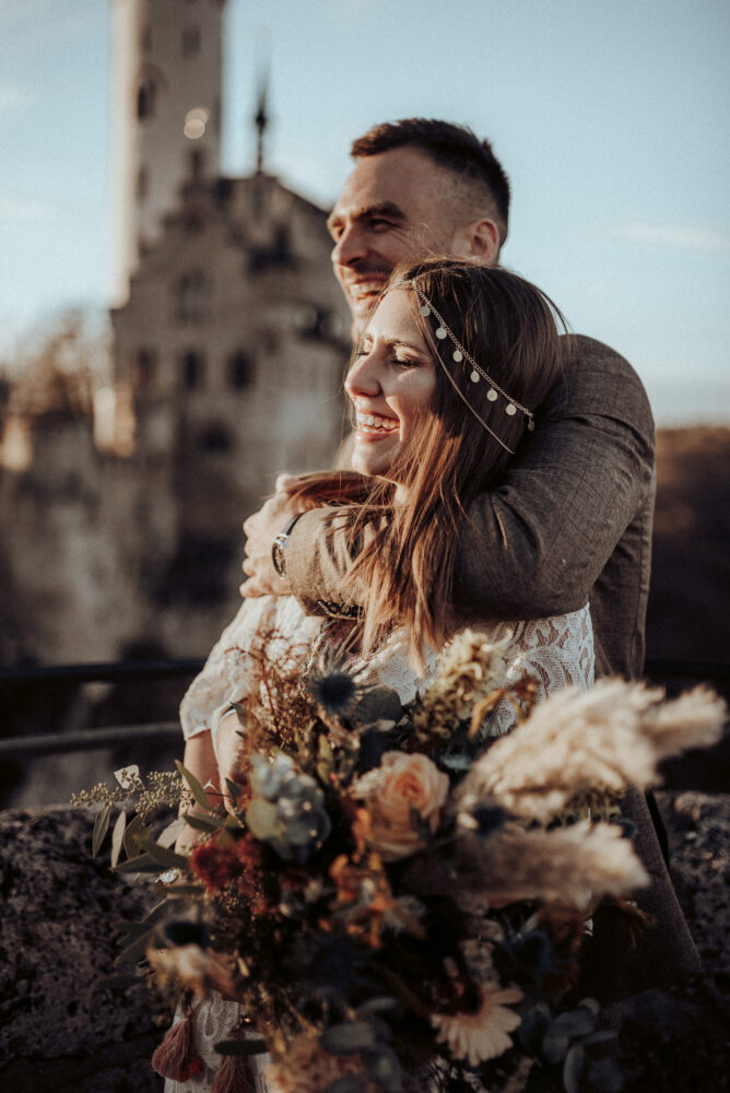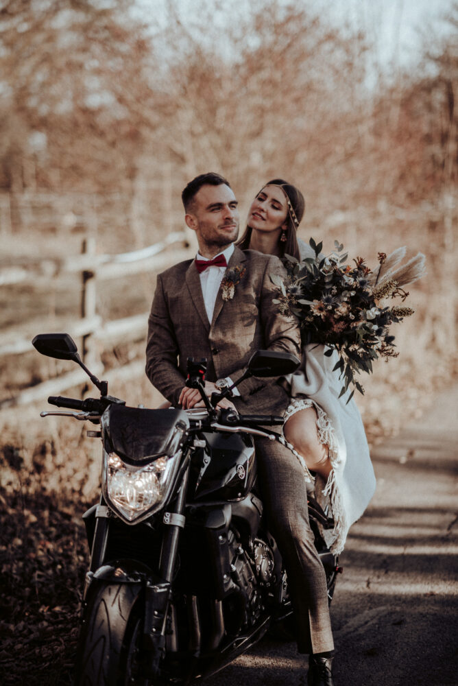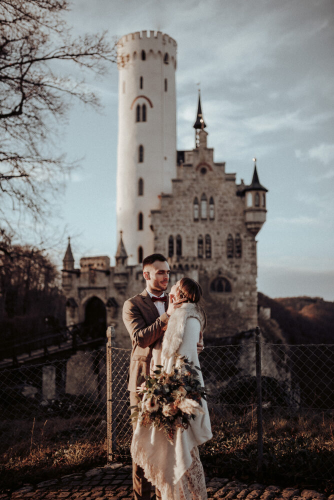 Der Stuttgarter Fotograf Koko Photography schafft es immer wieder, fantastische Bilderwelten zu kreieren. So auch bei diesem faszinierenden Styled Shoot auf Schloss Liechtenstein in Baden-Württemberg. Gemeinsam mit der Hochzeitsplanerin Hochzeitsverliebt schafft er es, eine winterliche Schlosshochzeit und das Boho-Gefühl auf natürliche Weise miteinander zu verbinden. Der Hochzeitsfotograf schenkt uns wunderbare Bilder in warmen Erdtönen, die gespickt sind mit einem Hauch Kühle. So fängt er die Stimmung des winterlichen Ambientes mit den ersten warmen Sonnenstrahlen ein. Das moderne Brautpaar fährt nach dem Ja-Wort herrlich unkonventionell mit dem Motorrad der Sonne entgegen, um den Abend beim Dinner zu genießen. Wir können nur sagen: Ob Elopement-Hochzeit oder große Party – feiert euch und euren Stil.