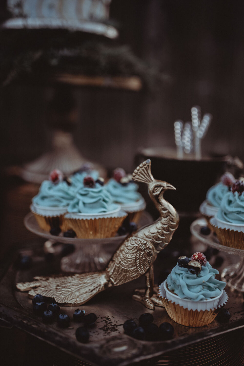 Fast zu schön zum Aufessen die Candy-Bar, in deren Mitte stolz die in Gold und Türkis dekorierte Hochzeitstorte von Cake Styling thront.