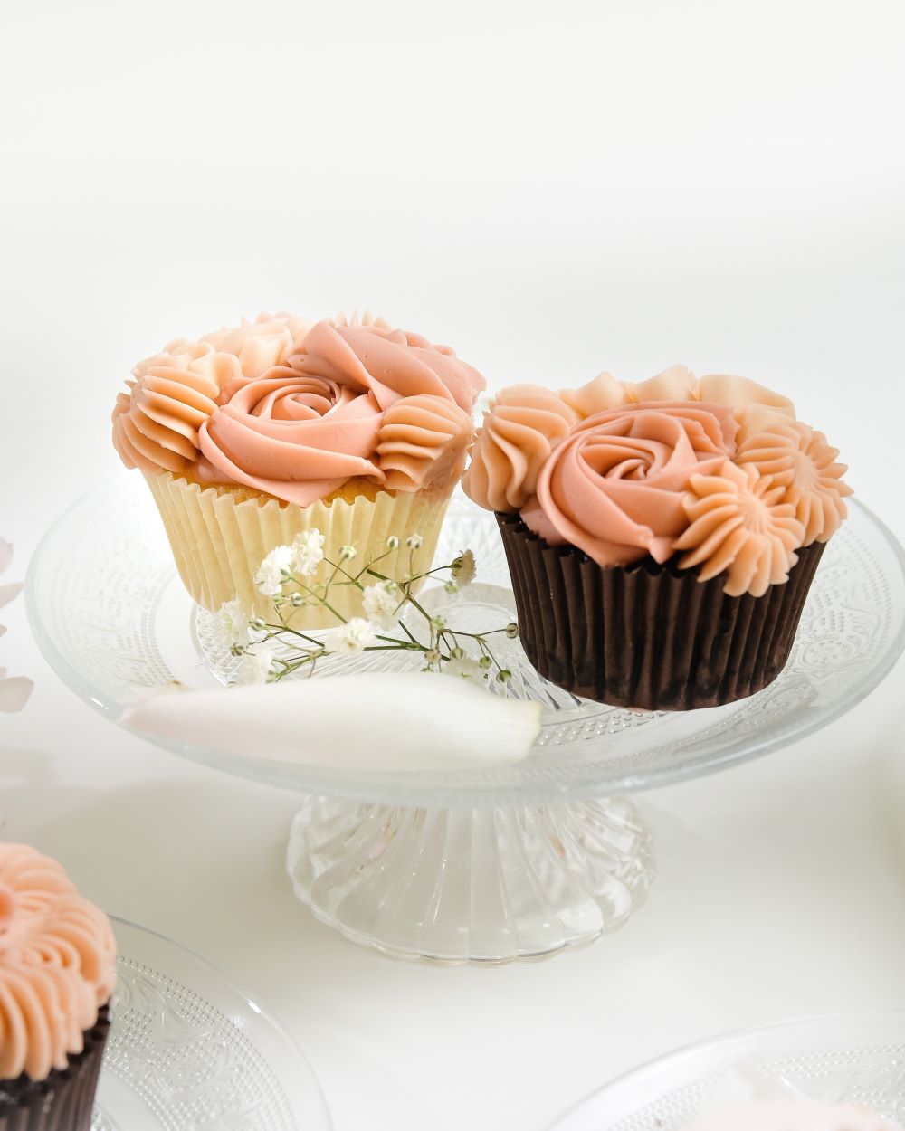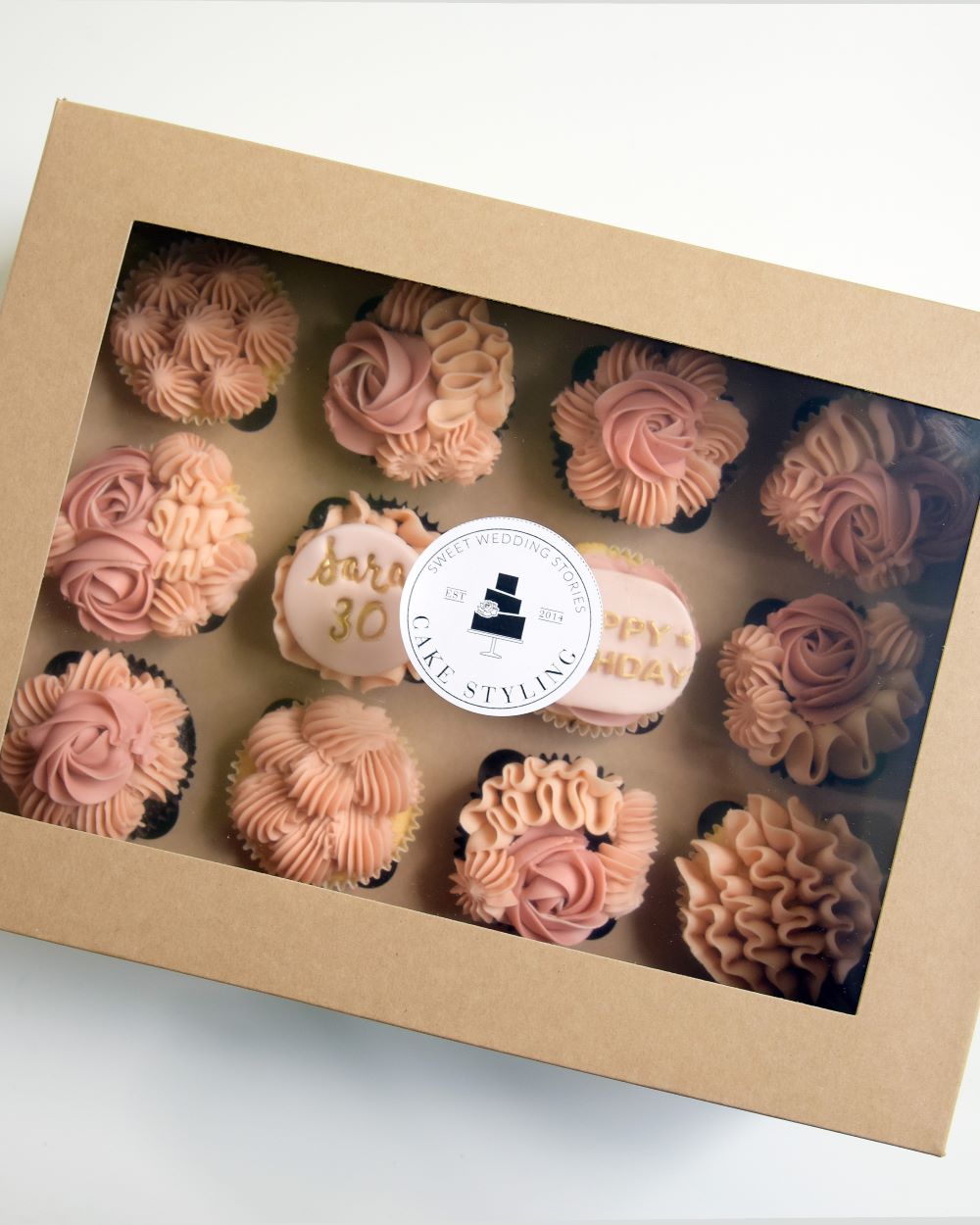 Leckere Cake Styling Cupcakes mit Beeren und Blumen als Deko  in einer Box mit 12 Cupcakes.