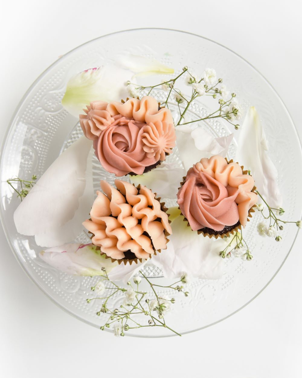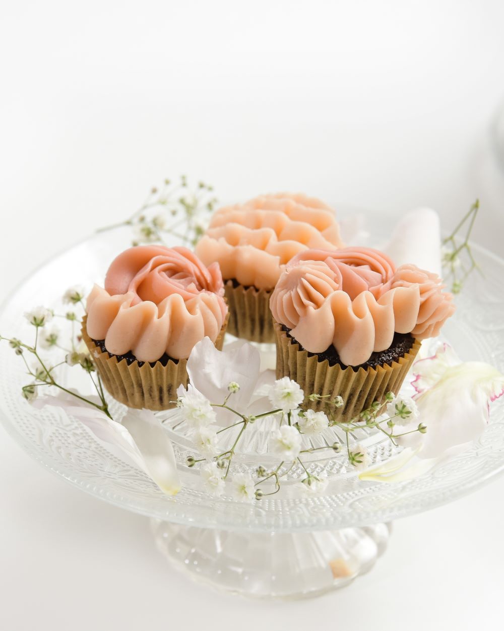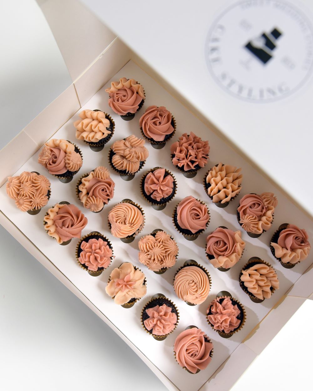 Leckere Cake Styling Cupcakes mit Beeren und Blumen als Deko  in einer Box mit 12 Cupcakes.