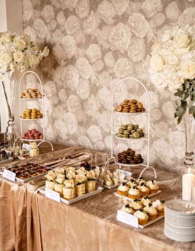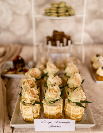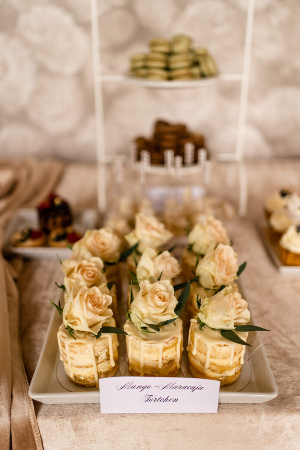 Die kreative Hochzeitsfloristik aus weißen Rosen von Die Kathe, ist ein großes Augenmerk der Hochzeitsdekoration. Sie harmonierte perfekt mit den 10.000 Schmetterlingen, die in der Saalkuppe den Gästen entgegen schwebten. Ergänzt wurde dieses umwerfende Hochzeitskonzept von hoch modernen Acrylkarten aus den fähigen Papeterie-Händen Watschönet. Diese Hochzeit sollte sich wie ein einziger WOW-Moment anfühlen. Es wurden keine Kosten und Mühen gescheut, um die Ideen des Brautpaars detailliert zu erfüllen. Goldenes Besteck unterstreicht die luxuriös gedeckten Hochzeitstische. Und auch die Hochzeitstorte im Schmetterlingsdesign ist mit Blattgold verziert. Ein richtiger Augenschmaus der eine Harmonie mit dem süß gedeckten Sweet Table von Cakestyling bildet.