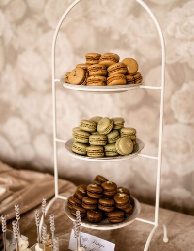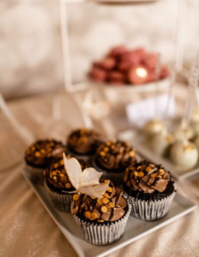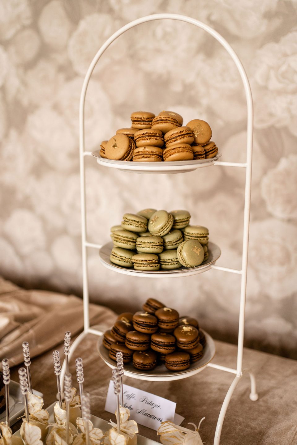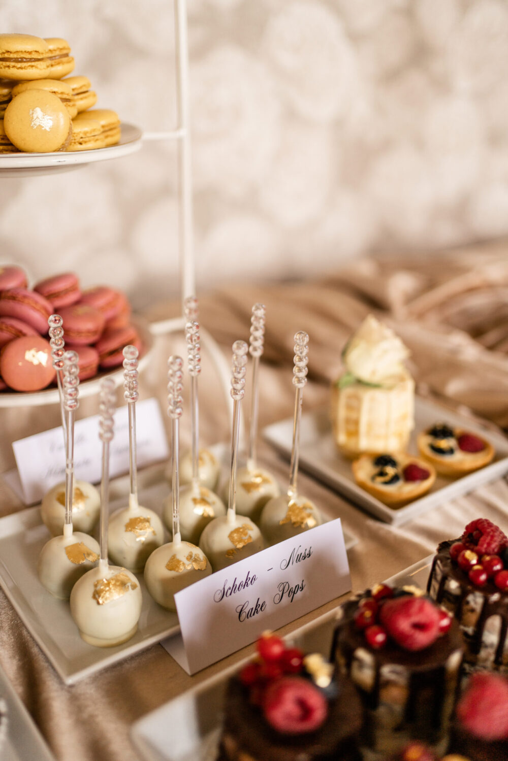 Damit die ganzen Eindrücke richtig verdaut werden konnten, stand im Kuppelsaal die Hochzeitstorte mit Schmetterlingen aus Blattgold zum Anschneiden auf dem Sweettable bereit. Um die Kalorien zu verbrennen, heizte der DJ die Tanzfläche auf und es wurde ausgiebig getanzt. Zum Abschied erhielt jeder Gast eine kleine personalisierte Geschenktüte gefüllt mit einer Champagnerflasche.